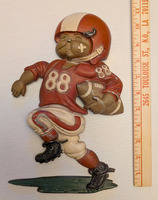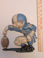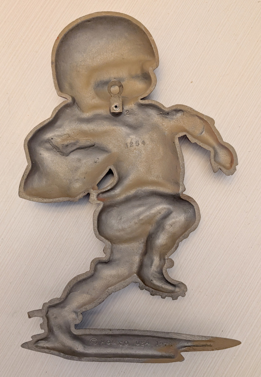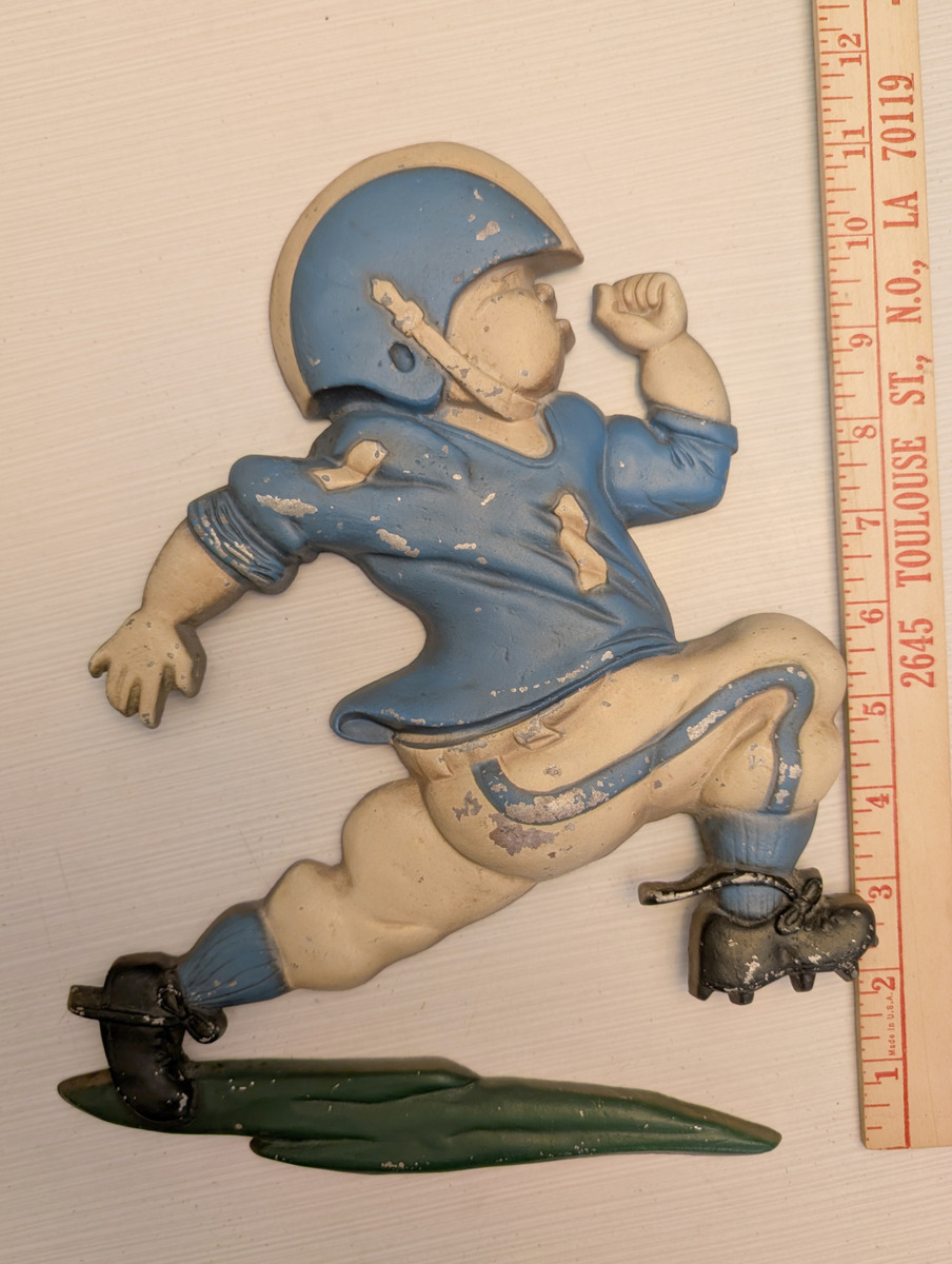 As the pics show, this is a set of 1976 Homco Football players. They are a cast metal, don't think it's iron, maybe aluminum but regardless, they are in good shape and solid metal, with a single nail hook on the back for hanging. Some distress on the paint. Pics also show relative size. Price includes delivery, will consider lower offers for pickup in Gretna. Thanks!