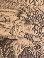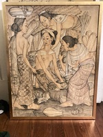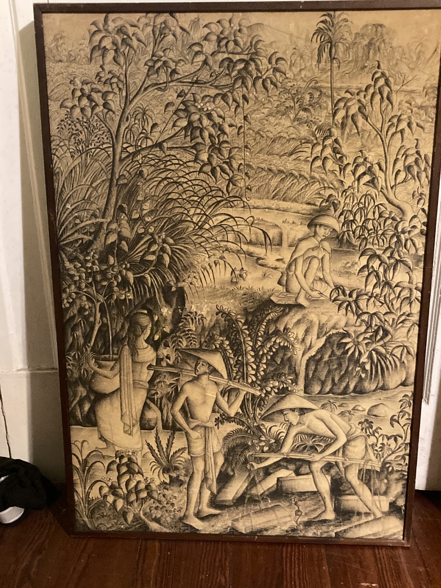 Circa 1960s Traditional Ubud region style paintings , painted on fabric (silk?) laid on board and framed . Both signed. Apx 2.5’ W x 3’ H . $800 for the pair or $450 each.