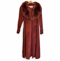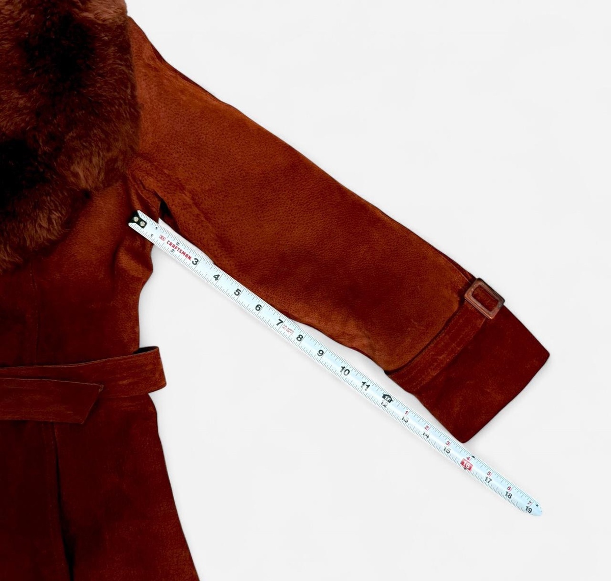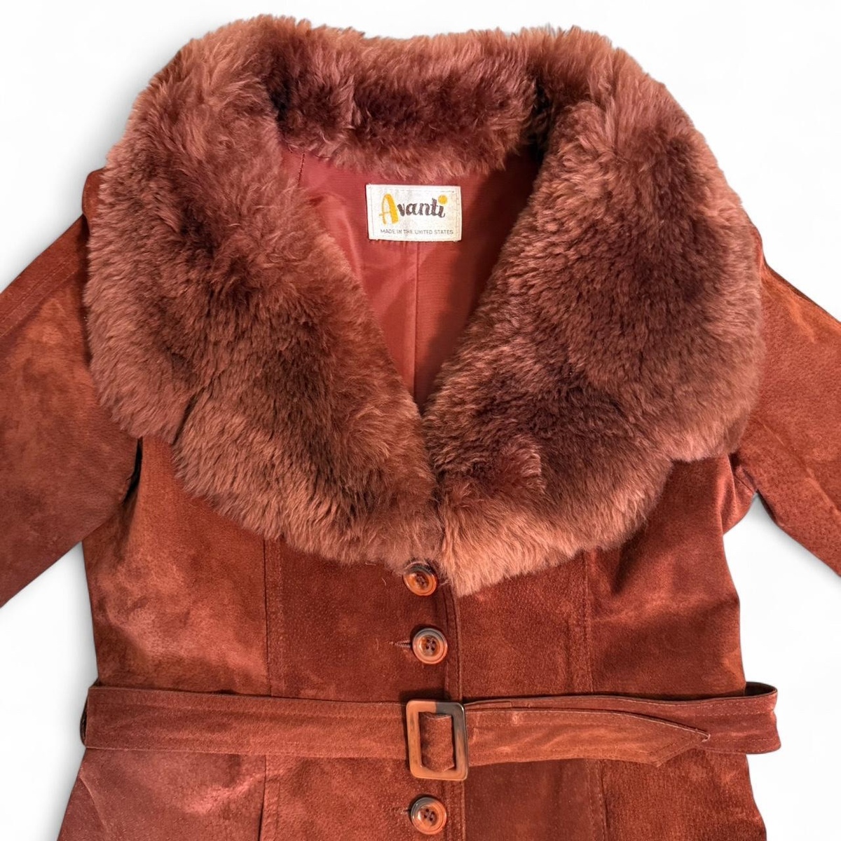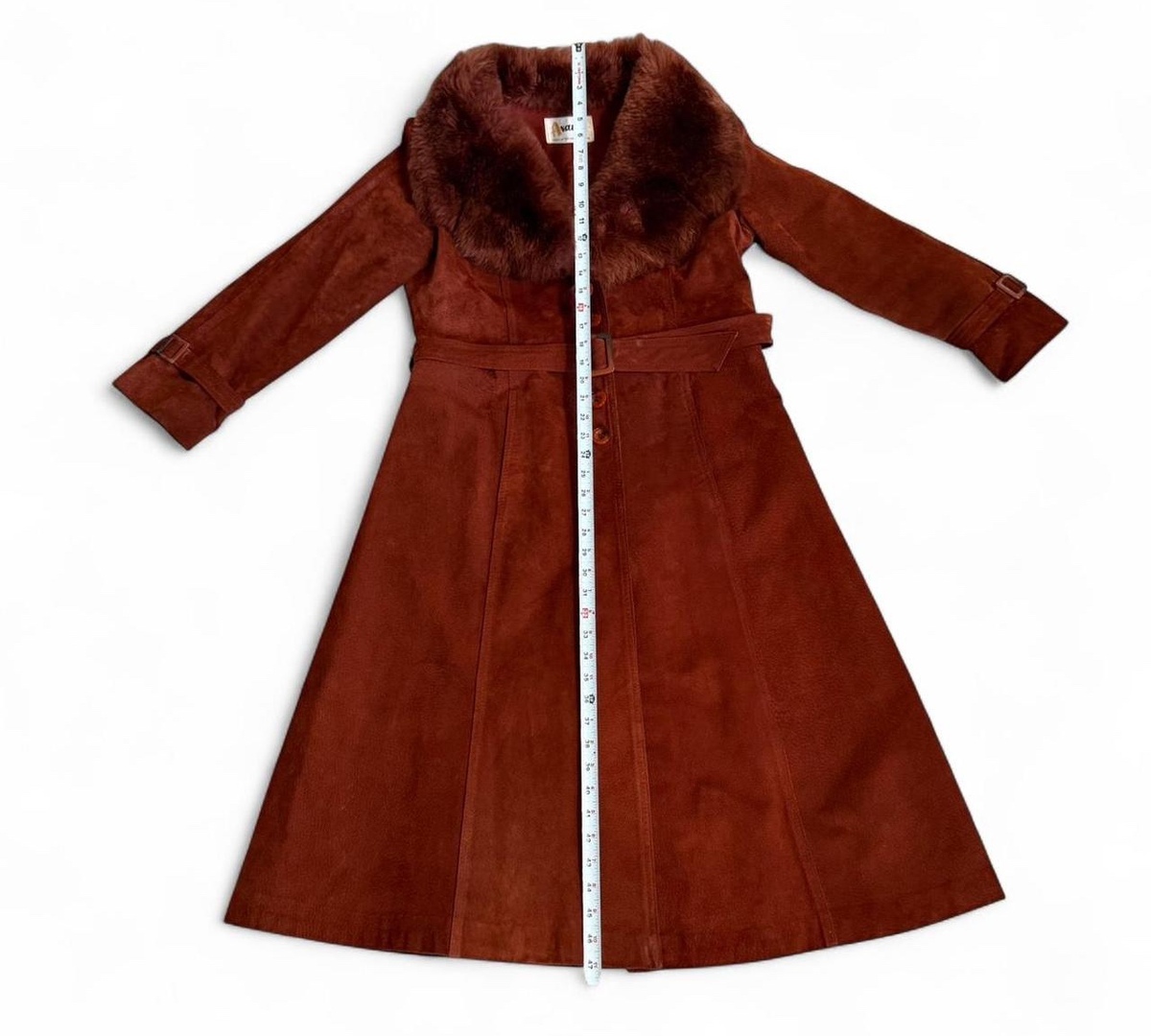 Vintage 70s Suede Maxi Coat w/ Faux Fur Shawl Collar (Size 12) Stunning true 1970s suede long coat featuring a dramatic oversized faux-fur shawl collar, belted waist, and full A-line silhouette. Super flattering, warm, and iconic — the perfect statement winter coat. Details: • Genuine suede body • Faux fur collar (super soft) • Button front closure • Matching suede waist belt • Buckle details at sleeves • Fully lined • Rich rust / Brick red suede / warm burgundy / burnt red color • Beautiful vintage condition with normal light wear for age Size: Tagged 12 Best fit: M/L depending on desired layering (see measurements) Measurements: • Length (top to bottom): 47” • Waist (laid flat): 18” • Sleeve (armpit to cuff): 15” There is a dark mark on the back upper right near the shoulder, looks like it could be an iron mark? Style vibes: Penny Lane, Almost Famous, 70s retro, boho, witchy winter, statement coat, Y2K revival