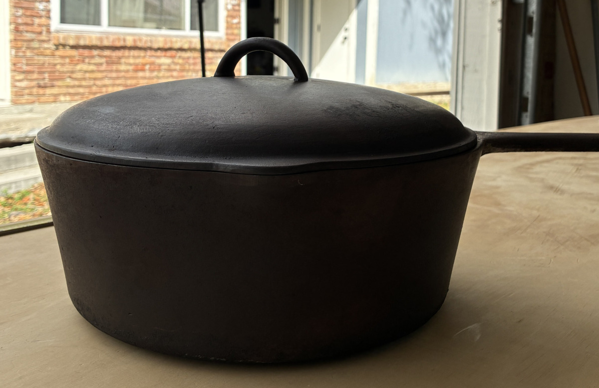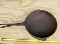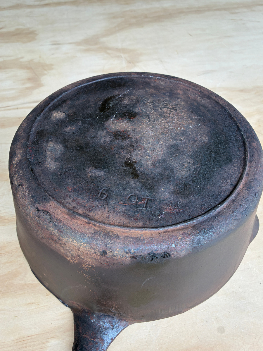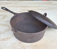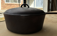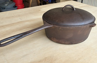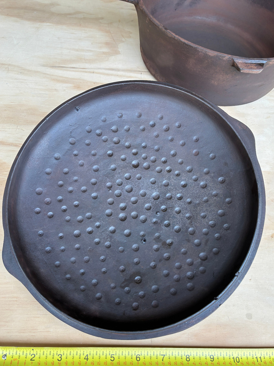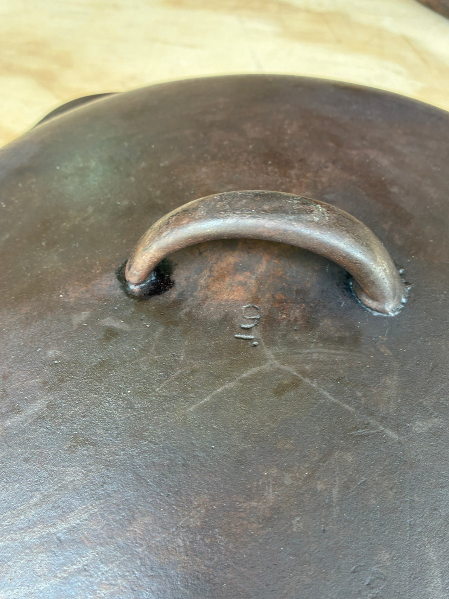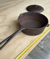 OBOThis vintage cast iron pot is perfect for cooking and serving a variety of dishes. It features a sturdy handle and a matching lid. The pot and lid is in good condition, freshly restored in a lye bath and seasoned. Interior is smooth. Minor exterior pitting commensurate with age, does not affect cooking. No.9 Lid in excellent condition. Pre-1967, known as the "southern workhorse". Dimensions: 21" total length; 10" handle, approx 15 lb set.