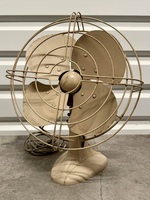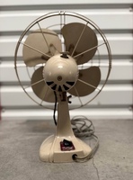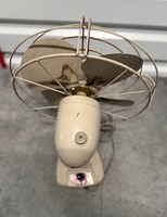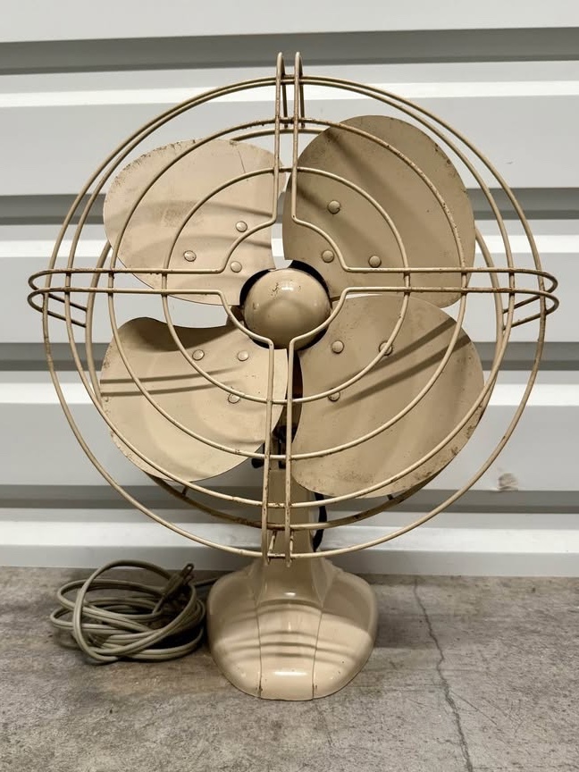 OBO Working condition, multi settings. Super quiet, white noise sound. Bring classic mid-century charm into your space with this vintage metal oscillating fan. Featuring a heavy steel base, metal cage, and four-blade design, this fan has that perfect industrial + retro aesthetic. Great as décor, a restoration project, photo prop, or for collectors of antique appliances. Height: 17" Width: 14" Length: 11" Details • Era: Likely 1940s–1950s • Material: All-metal construction (blades, cage, body) • Color: Cream / beige • Condition: • Cosmetic wear consistent with age — patina, scuffs, small rust spots (adds character) • Cord intact • Style: Mid-century industrial, Art Deco influence Perfect For • Vintage décor lovers • Photo studios / film props • Restoration hobbyists • Collectors of antique fans or industrial design pieces