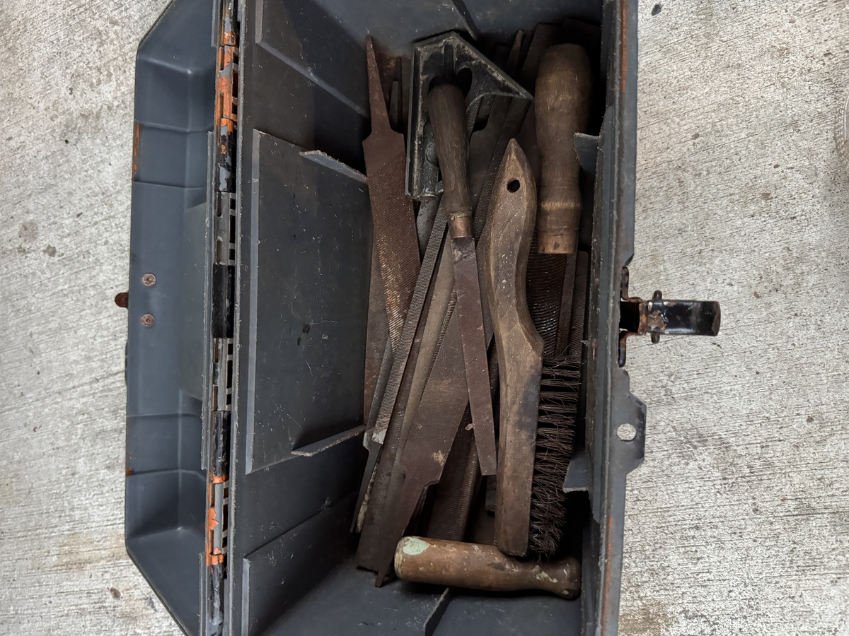 Sturdy vintage metal tool box with a classic latch closure. It’s filled with various files and metal tools. It shows signs of use and wear, adding to its rustic charm. Perfect for storing tools or as a unique decorative piece. Durable construction ensures lasting utility.