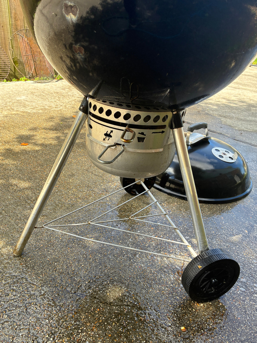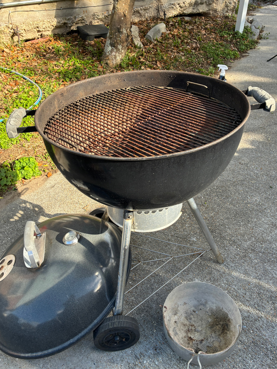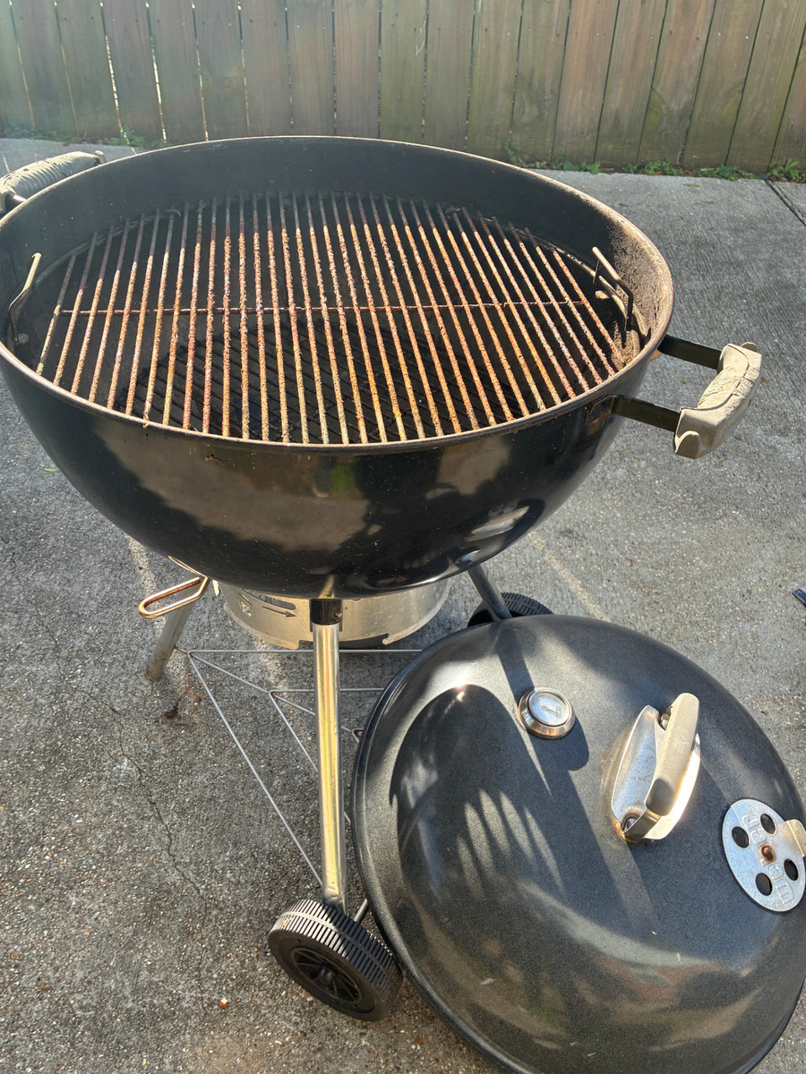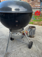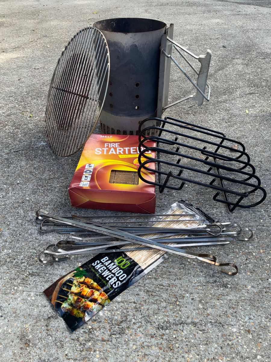 OBO22” Original Kettle® Premium Charcoal Grill Comes with all pictured bonus items: New, sealed bag Kingsford charcoal rib rack chimney starter fire starters New, sealed pack of 100 bamboo skewers Used, great condition metal skewers New box of Fire Starter