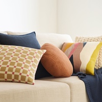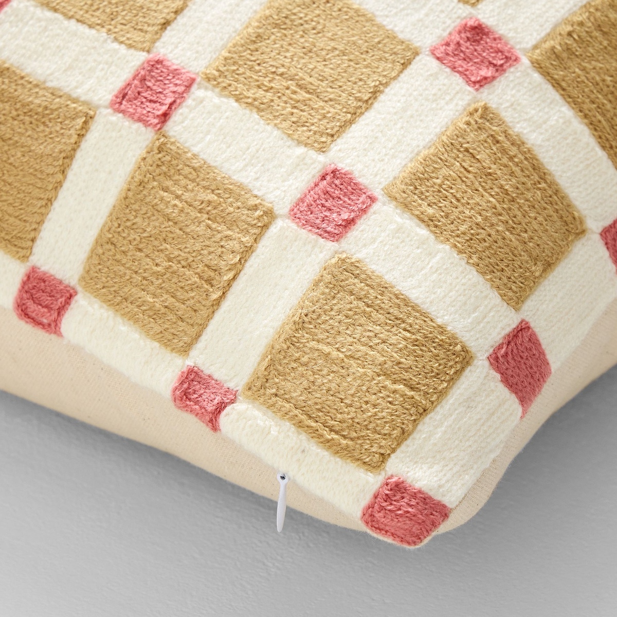 $35.00 29% off OBOWest Elm Crewel Geo Check Pillow + Pillow Cover 100% cotton base with acrylic embroidery. Pattern on front; solid on reverse. Hand embroidered. Zipper closure. Accommodates a 20"sq. Pillow Insert. Made in India. Machine wash on gentle cycle.
